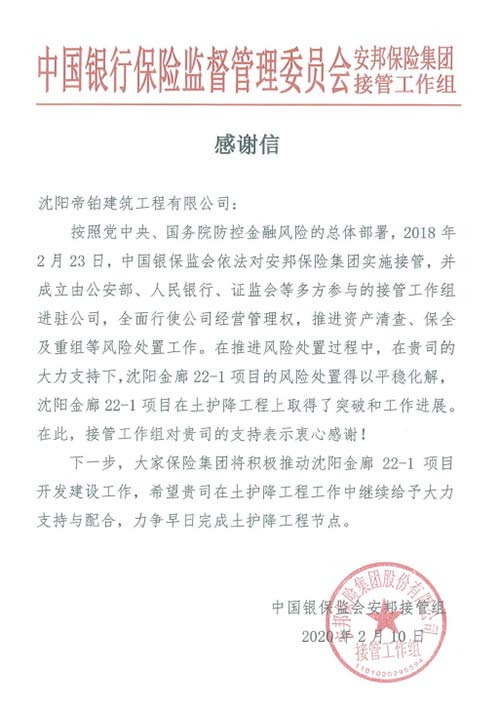 復(fù)工的同時,我們還收到了中國銀保監(jiān)會安邦接管組的感謝信,中國銀保監(jiān)會安邦接管組對我司的各項工作表示了高度的肯定,認(rèn)真的工作態(tài)度,有序的工作方式,造就了屹立不倒的帝鉑鐵軍!
