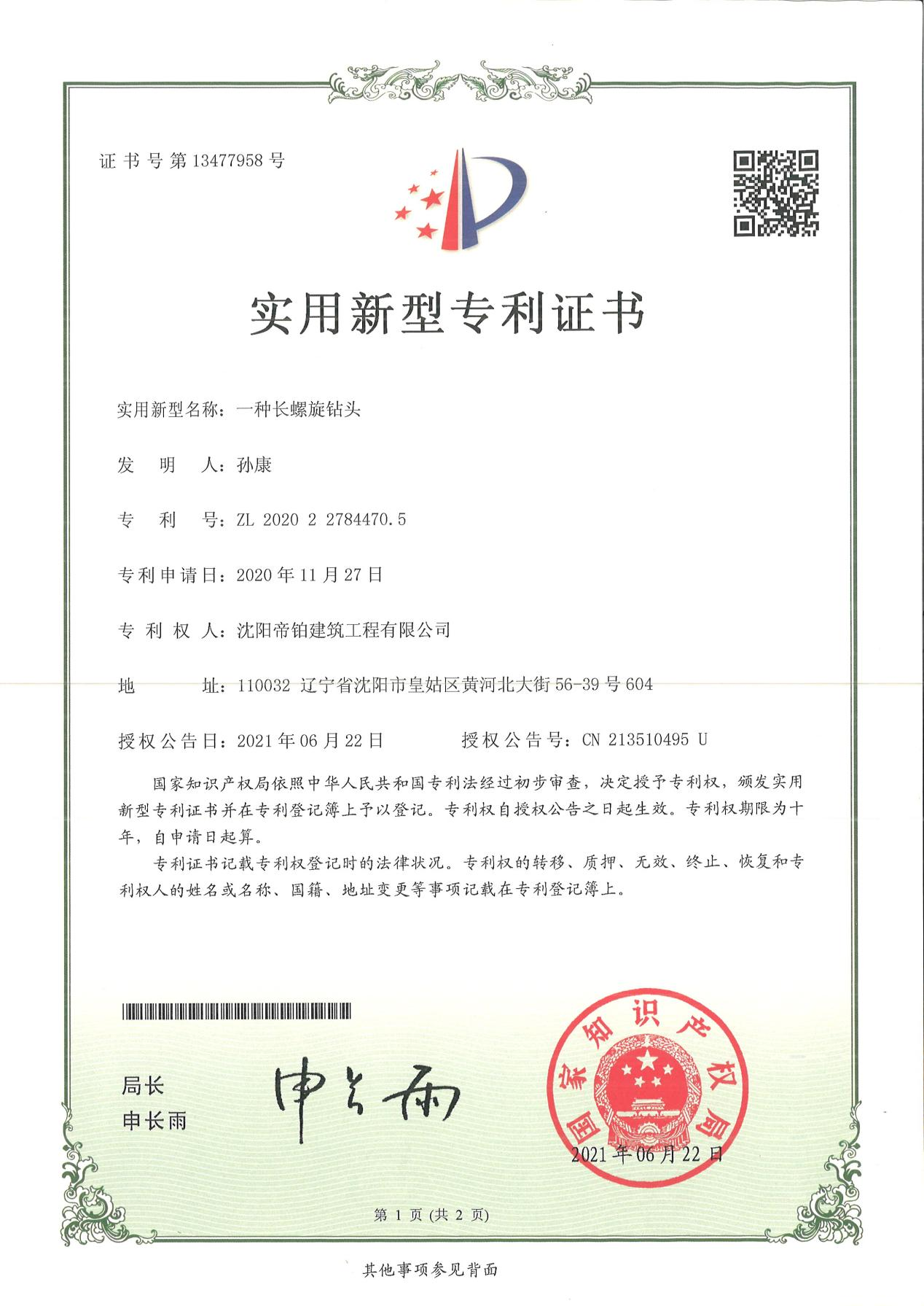 沈陽帝鉑建筑工程有限公司喜獲專利三項《一種沖擊成孔鉆頭》、《一種長螺旋鉆頭》、《一種調(diào)整平臺》獲得國家知識產(chǎn)權局的專利授權。上述發(fā)明是公司研發(fā)團自主研發(fā)項目,主要是針對工程實際施工過程中面臨的實際技術難題,經(jīng)過研發(fā)團隊多次試驗最終解決問題,并積極申請國家知識產(chǎn)權保護。