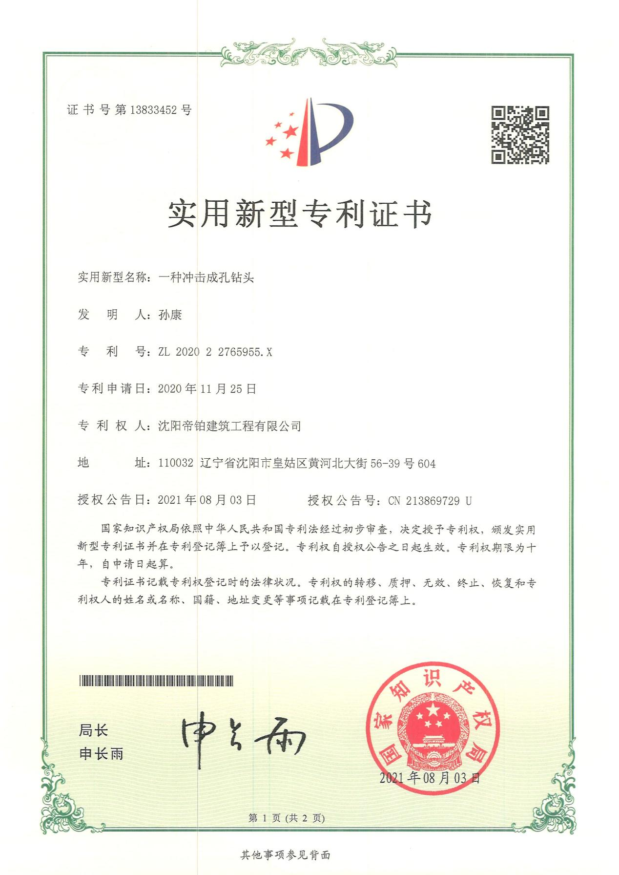 沈陽帝鉑建筑工程有限公司喜獲專利三項《一種沖擊成孔鉆頭》、《一種長螺旋鉆頭》、《一種調(diào)整平臺》獲得國家知識產(chǎn)權局的專利授權。上述發(fā)明是公司研發(fā)團自主研發(fā)項目,主要是針對工程實際施工過程中面臨的實際技術難題,經(jīng)過研發(fā)團隊多次試驗最終解決問題,并積極申請國家知識產(chǎn)權保護。