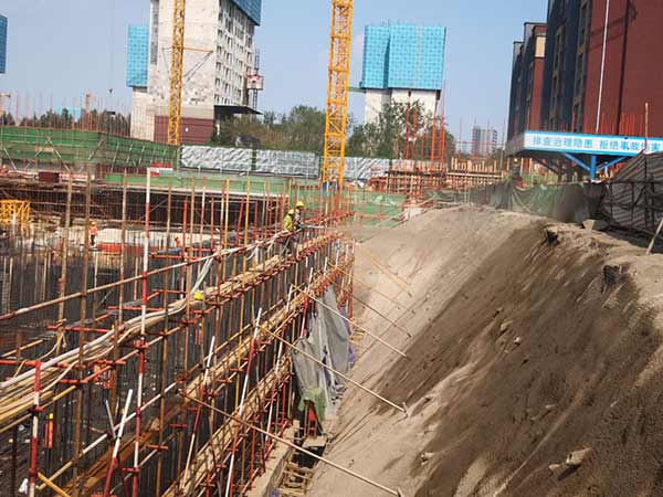 本次基坑支護施工是二期部分高層及地下停車場。采用樁錨+放坡素噴混凝土的支護體系,鋼管樁樁長9.0m,樁間距0.5m,兩排錨索,錨索間距為1.2m。